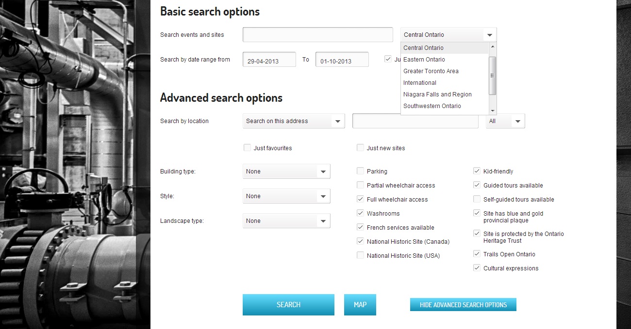 Last week we shared some then-and-now photos of Toronto’s streets, and today we want to continue with Ontario and share with you a great resource. An organization called Doors Open Ontario has been dedicating its efforts since 2002 to facilitating how Canadians goal is, every year between April and October, to invite Canadians to discover first-hand Ontario’s hidden heritage treasures, some of which have never been open to the public. The great thing about this website is that it provides an extensive list of events across Ontario (and it really is all across Ontario and not just concentrated in the Greater Toronto Area) for you to discover. Locating events is easy. You can either perform a basic search based on the dates and regions, or you can perform an advanced search where you can choose the dates, accessibility options, building type (a place of worship, a museum, etc.), style (Gothic, Victorian, etc.) and landscape type (natural heritage, landscape, etc.)