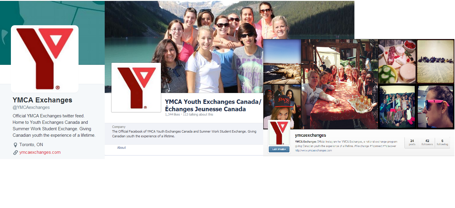 YMCA Exchanges’ Twitter, Facebook and Instagram Profiles. |Les profils Facebook, Twitter et Instagram d’Echanges Jeunesse Canada.