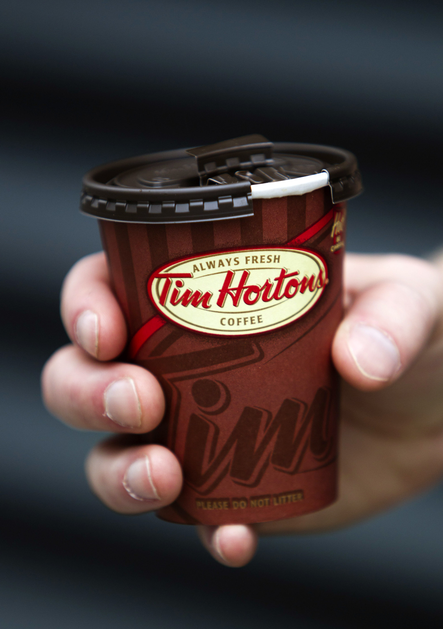 A cup of Tim Hortons Inc. coffee is displayed for a photograph in Toronto, Ontario, Canada, on Wednesday, Aug. 3, 2011. Tim Hortons Inc. is a chain of franchise fast food restaurants that serve coffee drinks, tea, soups, sandwiches, donuts, bagels, and pastries. Photographer: Brent Lewin/Bloomberg via Getty Images