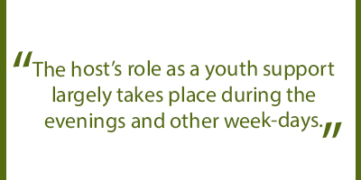 Let me explain this a little further, hosts spend time with their guest as they would with their own child.  During the work-week the youth are at work and do not require supervision.  During the weekends and one weekday evening, the youth spend time with their other group members doing organized activities with the Local Coordinator.  The host’s role as a youth support largely takes place during the evenings and other week-days. I’ve worked with a lot of potential hosts over the years and from the outset, many think they are unable to host. Thankfully they learn about ways it can be worked out.