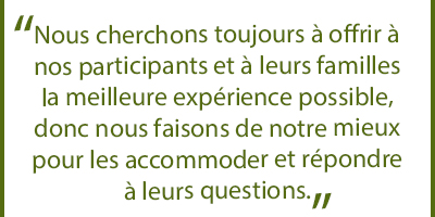 KZ: Exactement. Nous cherchons toujours à offrir nos participants et leurs familles la meilleure expérience possible, donc nous faisons de notre mieux pour les accommoder et répondre à leurs questions. J’espère que mes réponses étaient utiles. Nous avons aussi un guide d’accueil qui explique les choses plus en détail. Enfin, je comprends que dans certaines circonstances, l’hébergement d’un étudiant n’est pas toujours possible. Toutefois, afin de participer, une famille d’accueil alternative doit être trouvée. Nous faisons de notre mieux pour recruter des familles alternatives, mais nous demandons également à ce que les familles fassent leur part pour nous aider.